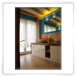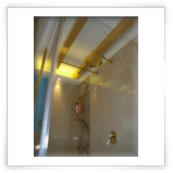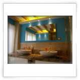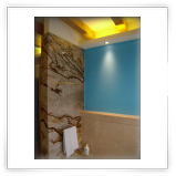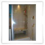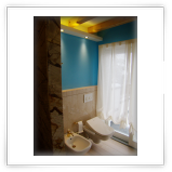 I rivestimenti e una parte del pavimento sono in marmo Travertino con alcuni inserti verticali in marmo screziato marrone, l'altra parte del pavimento è stata realizzata in legno di Rovere schiarito effetto vintage.