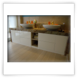 Il marmo screziato da queste meravigliose venature marroni è stato utilizzato anche per il top del mobile disegnato anch'esso su misura (Falegnameria: Market Legno -