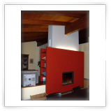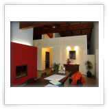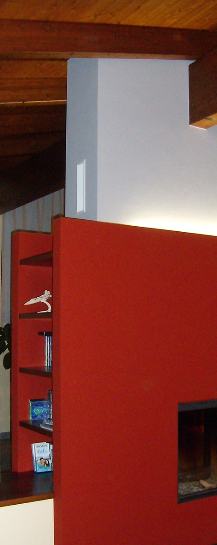 Il camino bifacciale separa la zona pranzo dalla zona divani.La parete in muratura è diventata elemento di arredo: verso la zona studio accoglie cassettoni e mensole, verso la zona soggiorno diventa un motivo decorativo che ha lo scopo di incorniciare mobili e quadri. Un telaio con vetri è stato previsto dalla fine della muratura fino al tetto in legno, per alleggerire questa divisoria e dare continuità alle finestre che girano su tutto il perimetro del terrazzo.